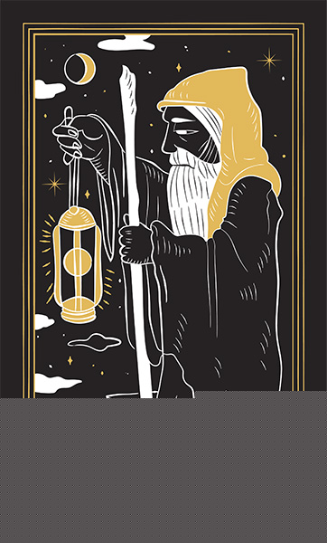 Card Nine represents the journey inward—the necessary solitude that precedes wisdom. The Hermit has climbed to the mountain's peak, leaving behind the noise and distraction of society. His lantern, containing the Seal of Solomon, lights the way not for himself but for those who follow. The wisdom he seeks cannot be found in books or from teachers; it emerges only in the silence of introspection.